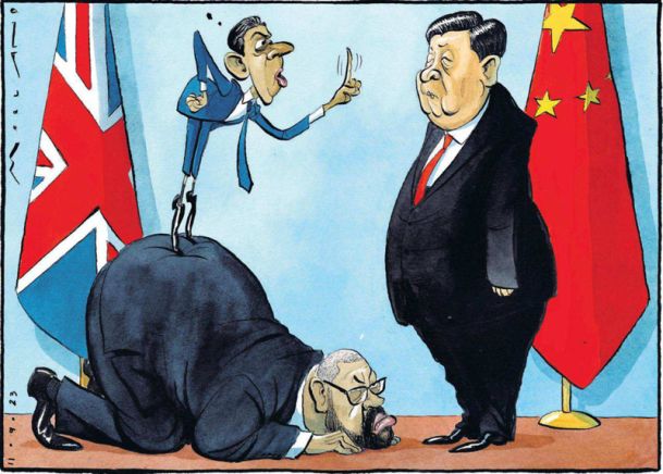 Иллюстрация политики Британии от The Times. Только что глава британского МИД Клеверли летал в Китай с подобострастными заявлениями в адрес Пекина, а позже в Индии Сунак пытался выговаривать премьеру Китая по поводу «демократии».