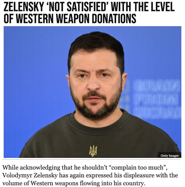 Признавая, что ему «не следовало бы слишком сильно жаловаться», Владимир Зеленский, тем не менее, вновь выразил недовольство объёмами западного вооружения, поступающего в его страну, пишет американский веб-сайт Breitbart.