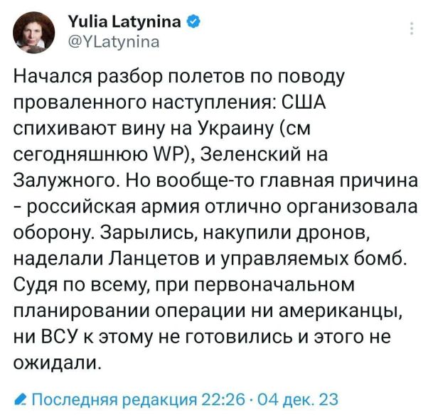 Напомним, что неудачи ВСУ в ходе так называемого контрнаступления привели не только к расколу в украинской "элите", но и к взаимным обвинениям Киева и Вашингтона в ошибках и просчётах.