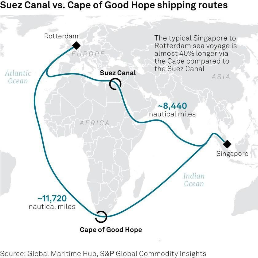 Ранее использование Суэцкого канала прекратила израильская судоходная компания Zim, одна из крупнейших в мире. Тайваньский судоходный гигант «Yang Ming Marine» принял решение сократить отправку грузов в Израиль. В настоящее время трафик через Красное море составляет от 10% до 12% мировых морских перевозок, на него приходится 5% мирового объёма транспортировки нефти.