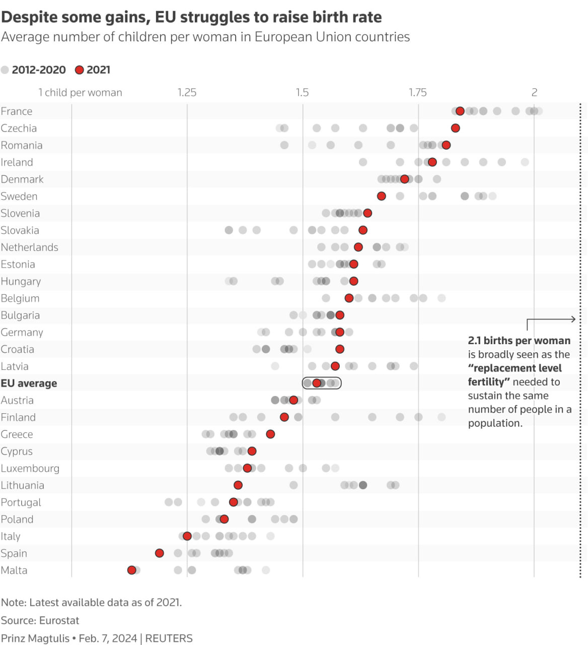 В течение последнего десятилетия коэффициент рождаемости в Европе застопорился на уровне 1,5 рождения на одну женщину. Это далеко от уровня 2,1, необходимого для поддержания численности населения. В конечном итоге это может привести к сокращению численности населения, хронической нехватке рабочей силы и трудностям в поддержании пенсионного обеспечения.