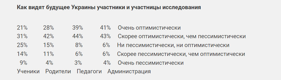 В целом, оценивают будущее своей “великой европейской державы” “очень оптимистично” всего лишь 21 % подростков — на фоне 28 % родителей, 39 % учителей и 41 % администрации школ. Чуть более среди школьников тех, что оценивают перспективы “скорее оптимистично” — 31 %, при 42 % у родителей, 44 % — у учителей, и 43 % — у администрации.
