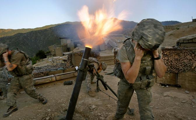 На фото: солдаты первого батальона 26-го пехотного полка армии США ведут минометный огонь с аванпоста Коренгал в афганской провинции Кунар, 12 мая 2009 года