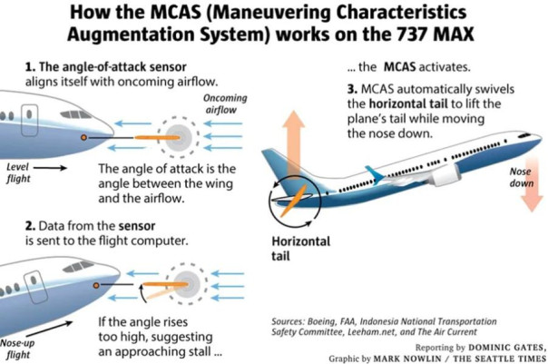 Смещённые вперед двигатели и их более высокая тяга придали Boeing737 МАХ тенденцию к самопроизвольному увеличению угла атаки и задиранию носа, создавая кабрирующий момент, при котором крылья теряют подъемную силу. Это и потребовало дополнительной защиты от сваливания. В управление самолётом была включена система расширения манёвренных характеристик (Maneuvering Characteristics Augmentation System, MCAS) − плохо разработанное программное обеспечение, которое лишило пилотов контроля над самолётом.