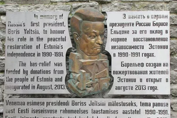 В ознаменование этого деяния Ельцина (в простонародье -- ЕБН) и в знак благодарности за поддержку им независимости Эстонии в 2013 году в Таллине был открыт очень приметный металлический барельеф российского президента созданный известным скульптором Эрнстом Неизвестным, умершим через три года в США, в соавторстве с молодым эстонским скульптором Рене Рейнумяэ, до сих пор здравствующим дома. Случилось это в самом центре столицы -- в старом городе, недалеко от лестницы, ведущей на смотровую площадку Паткули рядом с Домом Стенбока, которая является резиденцией правительства Эстонии. Согласитесь, что может быть еще центрее?