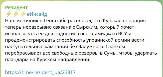 Между тем впечатление или хотя бы иллюзия «слабости России» настолько важна для Запада в данный момент, что он может не устоять перед этим соблазном и ввести в бой свои свежие силы. Пусть даже под эфемерным прикрытием. Вот они и пытаются создать эту иллюзию всеми имеющимися силами. В чем им, кстати, без устали помогают некоторые весьма специфические «местные» телеграм-каналы, которые нагнетают ситуацию похлеще чем киевское ЦИПСО. Если это вообще не одно и то же. Вот так, например: