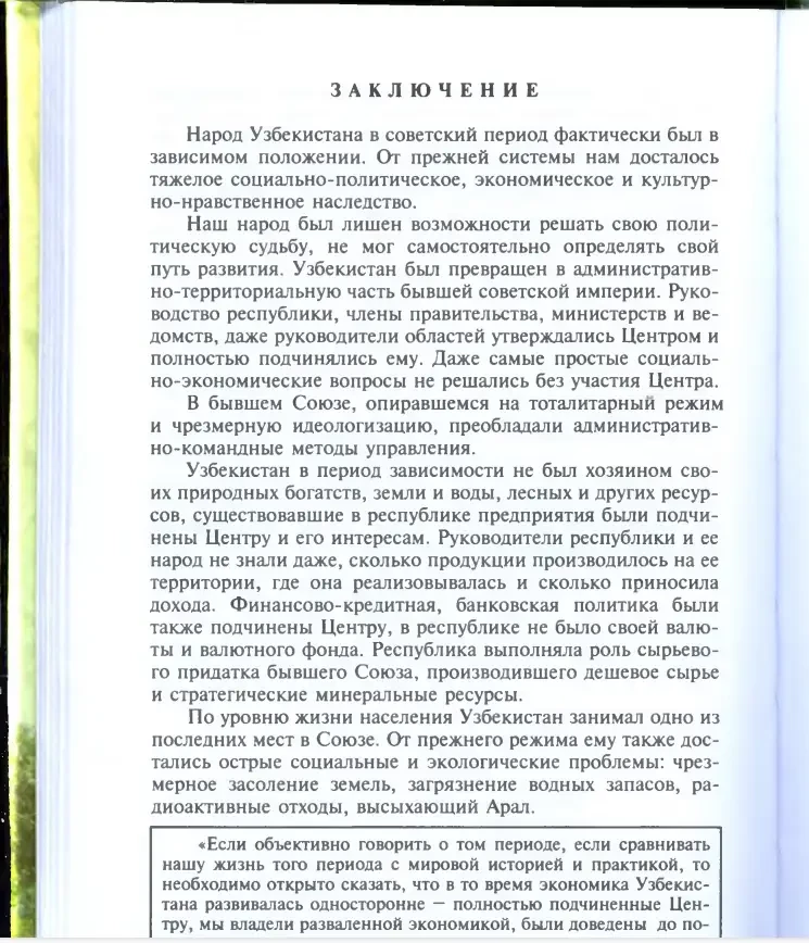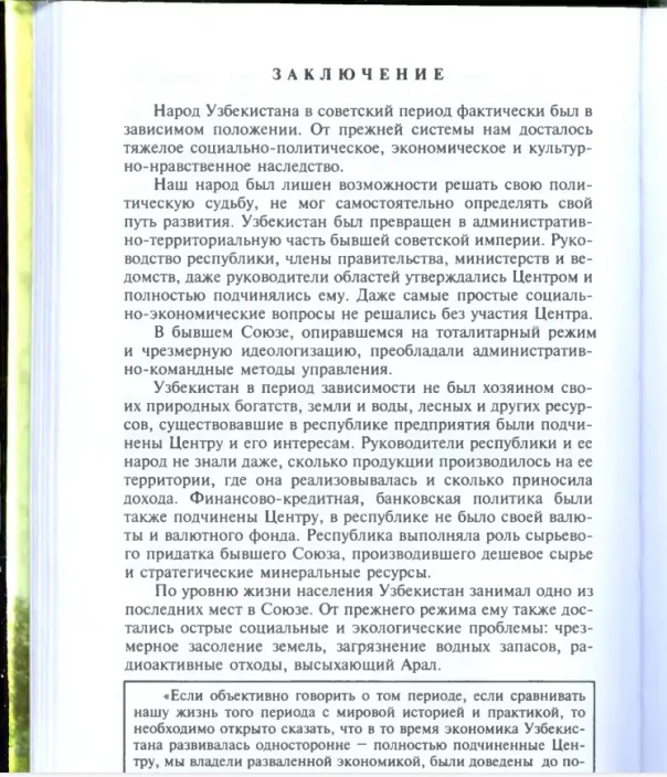 «Народ Узбекистана в советский период фактически был в зависимом положении. От прежней системы нам досталось тяжелое социально-политическое, экономическое и культурно-нравственное наследство… Узбекистан в период зависимости не был хозяином своих природных богатств, земли и воды, лесных и других ресурсов, существовавшие в республике предприятия были подчинены Центру и его интересам. Финансово-кредитная, банковская политика были также подчинены Центру, в республике не было своей валюты и валютного фонда. Республика выполняла роль сырьевого придатка бывшего Союза, производившего дешевое сырье и стратегические минеральные ресурсы».