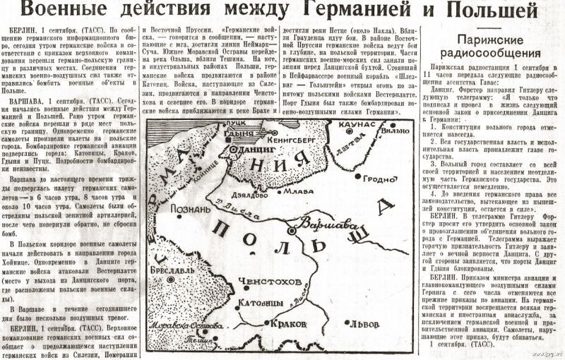 Первые сводки с театра военных действий «Правда» поместила в раздел международной хроники на 4-й полосе: «…Германские войска в соответствии с приказом германского верховного командования перешли германо-польскую границу в различных местах. Соединения германских военно-воздушных сил также отправились бомбить военные объекты в Польше…»