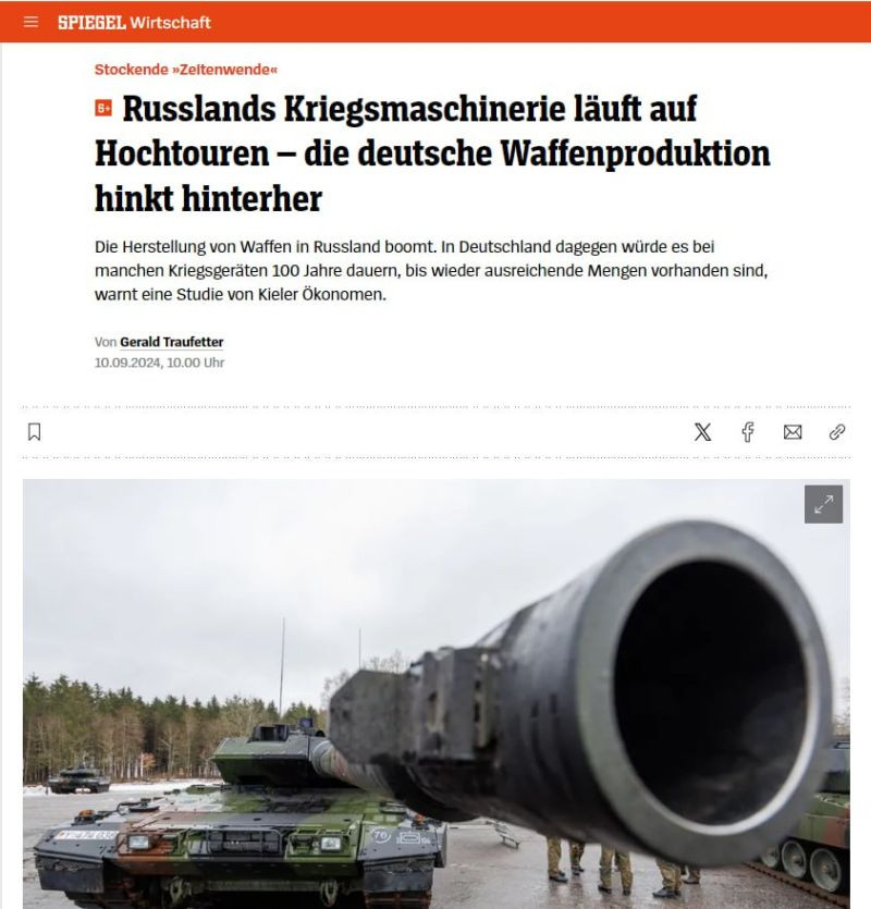 «Военная машина России работает на полную мощность – немецкое производство оружия отстаёт» – статью под таким заголовком публикует Der Spiegel, сетуя, что Германии и НАТО грозит опасность все больше отстать от России в военном отношении. Во всяком случае, таков результат исследования, проведенного Кильским институтом мировой экономики (IfW).