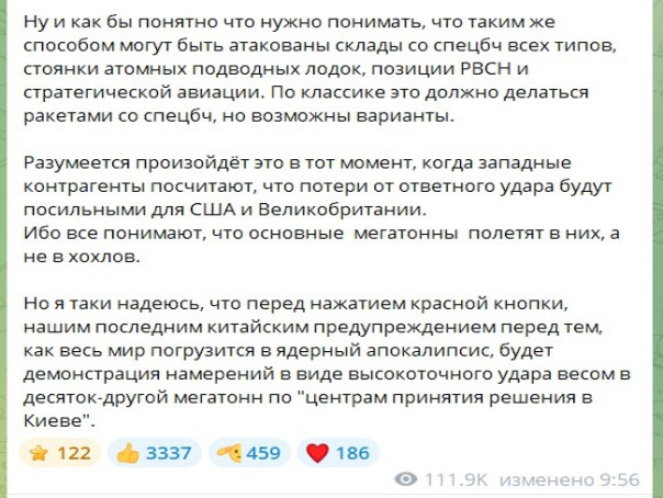 6. Что же касается применения ядерного оружия непосредственно по Западу, что в определенный момент может стать необходимым и неизбежным, то решение о выборе такого момента является исключительной прерогативой высшего государственного руководства РФ, обладающего для принятия данного решения исчерпывающей информацией и соответствующими полномочиями. Именно это должны знать и четко понимать рядовые граждане, а не идти на поводу у таких крикунов, которым любое море по колено.