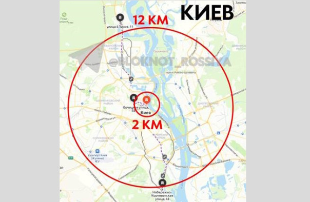 «После попадания по центру столицы Украины заряда около 50 килотонн радиус полного поражения составит 2 км. Частичного и полного выгорания — 12 км.