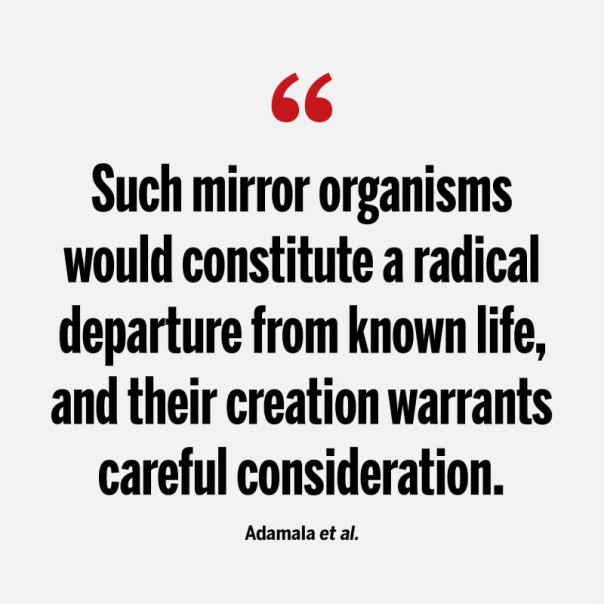 Международная группа лауреатов Нобелевской премии и экспертов в разных областях знаний, в том числе иммунологии, фитопатологии, экологии, эволюционной биологии и биобезопасности опубликовала в журнале Science статью, в которой предупреждает, что бактерии, созданные на основе зеркальных отображений молекул, встречающихся в природе, могут закрепляться в окружающей среде и обходить иммунную защиту природных организмов, подвергая людей, животных и растения смертельному риску.