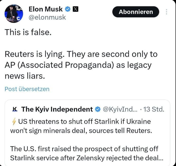 Тем не менее Илон Маск также 22 февраля написал, что Reuters лжёт по поводу возможного отключения ВСУ от Starlink. «Они уступают только Associated Press в качестве традиционных новостных лжецов» – такое сообщение он разместил в 22:01 мск в соцсети X, заблокированной в России.