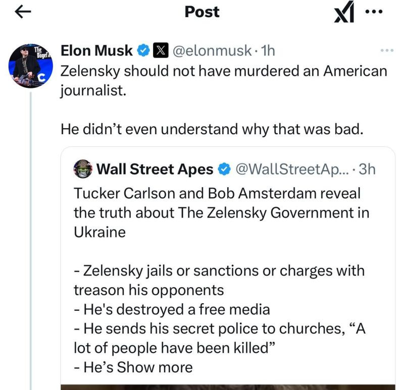 Напомним также, что на днях Илон Маск обвинил Зеленского в смерти американского журналиста Гонсало Лира, который был замучен в застенках Харьковского СИЗО в январе 2024 года за то, что собирал материалы о преступлениях киевского режима. «Зеленскому не следовало убивать американского журналиста. Он даже не понял, почему это плохо», – написал Маск.