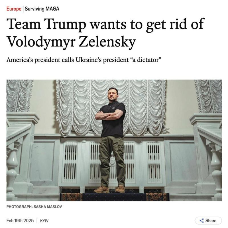 На днях британский журнал Economist опубликовал статью под красноречивым названием «Команда Трампа хочет избавиться от Владимира Зеленского». «Похоже, что Трамп хочет избавиться от Зеленского, которого он никогда не любил и которого считает сложным. Речь идёт не о выборах, а об избавлении от Зеленского», – уточняет издание.