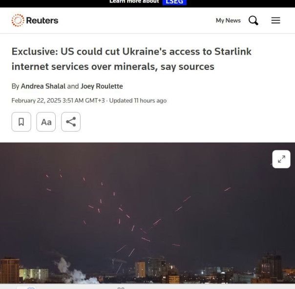 Британские СМИ, такие как Reuters и Sky News, в это же самое время стали активно писать о том, что Зеленский своим отказом от сделки с Трампом может способствовать отключению ВСУ от спутниковой системы Starlink. Это приведёт к дезинтеграции управления, потере возможностей для разведки и координации ударов.