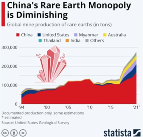Среди целей продвигаемых администрацией Трампа «редкоземельных» проектов – укрепление переговорных позиций в непростом диалоге с Китаем, добившимся существенного прогресса в сфере разведки, добычи и извлечения редкоземельных элементов. Их текущие запасы в Китае занимают первое место в мире – 44 миллиона тонн, что составляет 40% от общих мировых запасов.