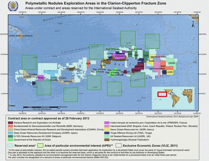 Китай имеет пять контрактов, выданных ISA, на поиск ресурсов на дне Тихого и Индийского океанов, и эти контракты охватывают все типы подводных минеральных ресурсов. Китай имеет наибольшее количество из 22 контрактов, выданных организацией.