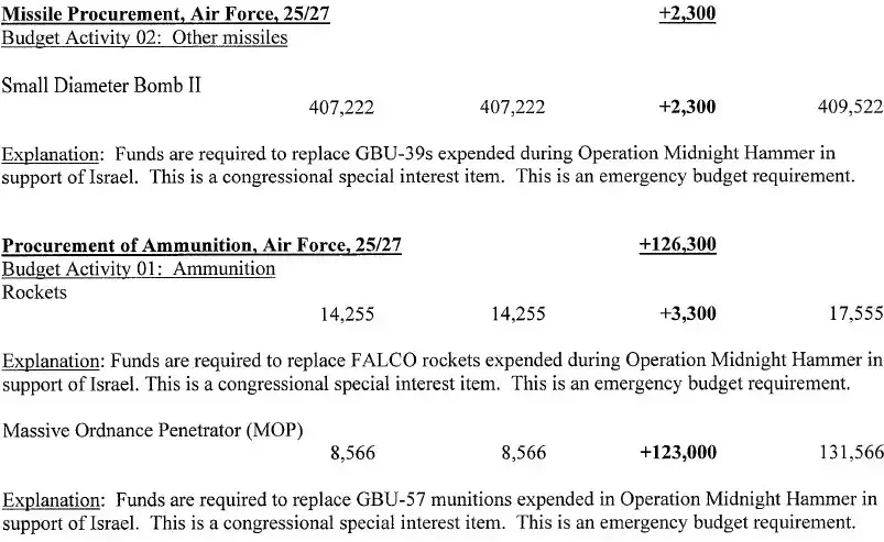 Не приводится никаких подробностей об общем количестве израсходованных боеприпасов (хотя есть данные о количестве сброшенных планирующих авиабомб) или о том, сколько боеприпасов планируется закупить на дополнительные средства. Ещё 9,976 миллиона долларов необходимо выделить на «временное размещение персонала, обеспечивающего операцию «Полуночный молот».