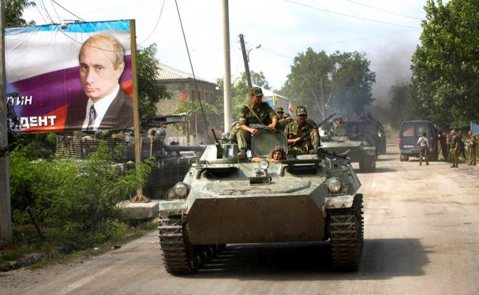 На фото: осетинские солдаты на бронетранспортере въезжают в Цхинвал, рядом с гигантским портретом премьер-министра Владимира Путина и надписью на кириллице: «Путин — наш президент», 2008 год.
