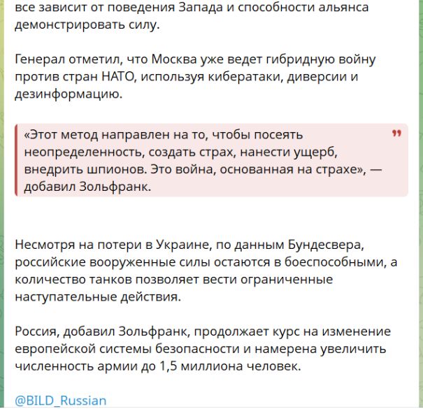 Нетрудно убедиться, что например, в этом устрашающем тексте от целого немецкого генерал-лейтенанта нет даже малейшей попытки ответить на этот фундаментальный вопрос. Без чего, между прочим, все остальные конструкции химеры под названием «русская военная угроза», элементарно повисают в воздухе. Просто потому, что им больше не на что опереться.