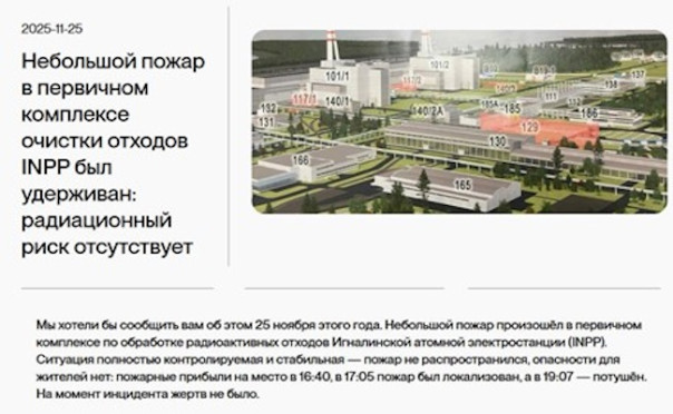В конце ноября в Литве горела атомная станция. Трагедия произошла в первичном комплексе по обработке радиоактивных отходов Игналинской АЭС. Несколько часов пламя пожара бушевало 25 ноября в охраняемой зоне станции в отдельном комплексе по управлению радиоактивными отходами (здание 130), находящемся в более чем 250 метрах от основных блоков АЭС.