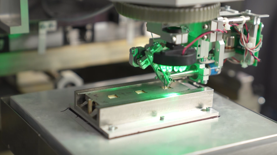 "Вот так выглядит один из основных этапов сборки микросхемы, называется "разварка". Используется в том числе золотая проволока. Здесь же делают чипы для авиакосмического приборостроения", – сообщил корреспондент.