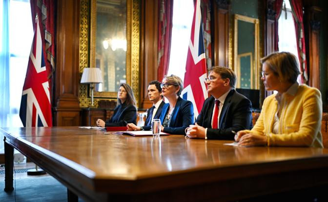 На фото: министр иностранных дел Великобритании Иветт Купер (в центре) на виртуальном саммите, посвященном обсуждению путей возобновления работы Ормузского пролива