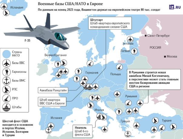 Косово – военный укреплённый Лагерь Бондстил, контроль над Балканами; Норвегия – ключевой в регионе Объединенный Центр боевых действий и средоточие образовательных, тренировочных, научно-испытательных центров НАТО. В Португалии авиабаза «подскока» Поле Лажеш на Азорских Островах. В Испании военно-морская Рота, узел ПВО/ПРО и флотский центр.