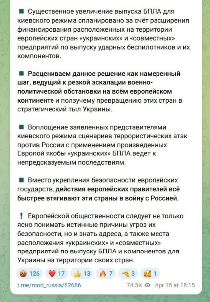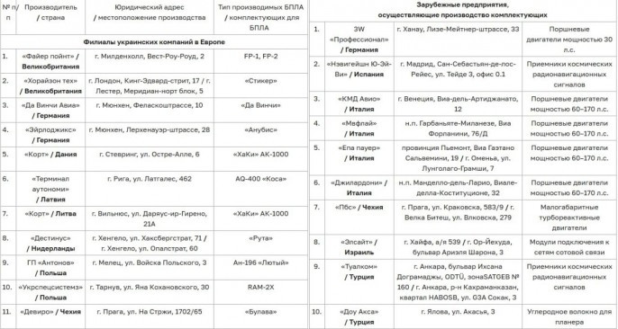 Европейской общественности следует не только ясно понимать истинные причины угроз их безопасности, но и знать адреса, а также места расположения «украинских» и «совместных» предприятий по выпуску БПЛА и компонентов для Украины на территории своих стран".