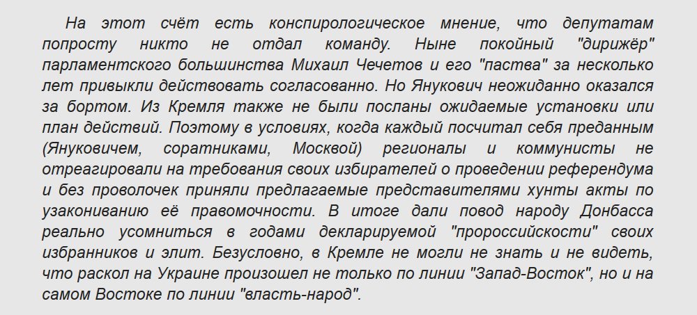 Нужно подчеркнуть, что бывшее парламентское большинство (депутаты Верховной Рады от Партии регионов Януковича и Коммунистической партии Симоненко), которое в политических кругах именовалось "донецким" или "пророссийским" не только реально могло не только на корню остановить "антитеррористическую операцию" или "президентские выборы" при живом-то президенте, но и имело возможность делегитимизировать саму хунту ещё до "коронации" майданного и.о. президента Александра Турчинова. Для этого достаточно было сложить мандаты в знак протеста против государственного переворота. Но никто не сделал этого, ссылаясь на некие "моральные обязательства перед своими избирателями" и угрозу распада Украины. Фактически те народные избранники, которые представляли Крым и Донбасс, поддержали самозванцев, узаконили власть толпы, наделили полномочиями активное радикальное меньшинство и лишили весомой части конституционных прав пассивное большинство граждан.