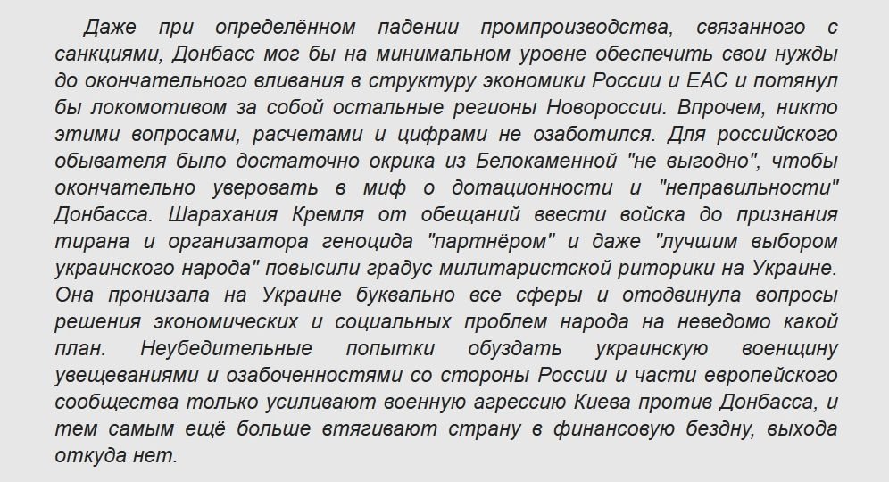 Кроме всего этого Донбасс обладает огромным потенциалом приватизации производственных мощностей. Ради получения прибыли от продажи указанных предприятий, которая способна хотя бы на короткий период отсрочить банкротство Украины, хунта и содержащие её олигархи и объявили войну собственному народу на уничтожение.
