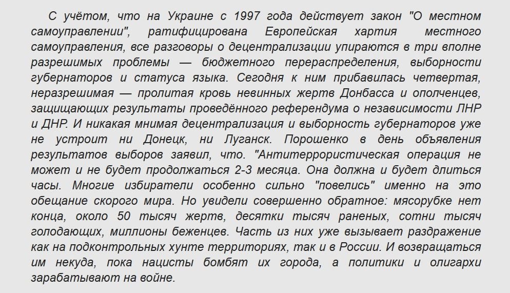 Так, к примеру, Порошенко предложил децентрализировать власть и дать больше прав, полномочий и средств власти на местах. Что на протяжении многих лет было ключевым пунктом всех предвыборных программ Виктора Януковича и Партии регионов, далеко не рядовым членом которой был в своё время и сам Пётр Алексеевич. (вставка фото из газеты). Федерализация Украины была и одним из условий, которые на первом этапе поддержки донецкого восстания в ходе Женевских переговоров требовала и Россия. Именно федерализация, то есть предоставление административным субъектам прав автономий, а не крючкотворная децентрализация!