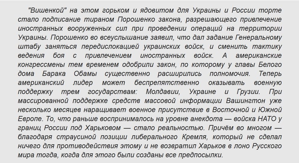 Некоторые аналитики увещевают российский народ в том, что у России есть право вето на решения о вводе иностранных войск на Украину. Однако пора бы обратить внимание, что СБ ООН никак не реагирует на нарушение хунтой минских договоренностей, это раз. И Парламентская ассамблея Совета Европы (ПАСЕ) большинством голосов проголосовала за то, чтобы признать Россию агрессором, это два. Крым в этой резолюции назван "оккупированной" территорией.