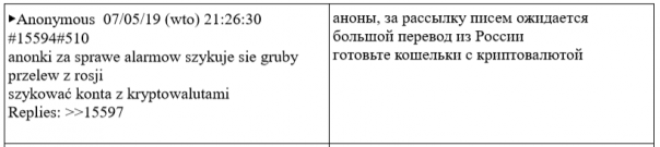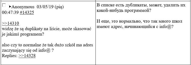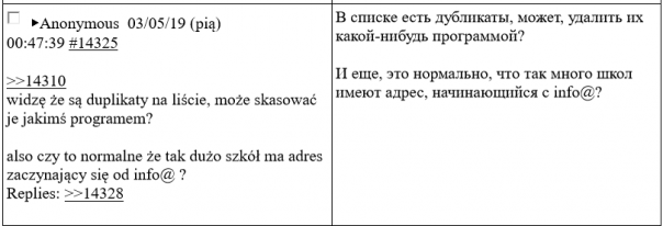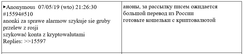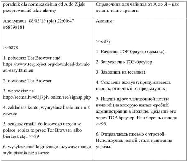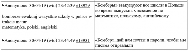 В мае этого года польские СМИ, как обычно со ссылкой на анонимные источники, сообщили, что российские спецслужбы в 2019 году использовали свои старые и уже засветившиеся аккаунты в интернете, чтобы сагитировать «пользователей сети интернет» разослать сообщения о минировании польских школ в период выпускных экзаменов. «Пользователи сети интернет», о которых идет речь, это анонимные авторы польского форума Lolifox. В апреле-мае 2019 года они действительно обсуждали и планировали рассылку ложных писем о минировании школ. Сайт был удален, но сохранилась его архивная копия со всей перепиской этих «бомберов».