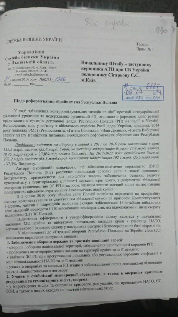 Вот, к примеру, секретный документ Львовского областного управления СБУ от июля 2014 года. В этот период Украина очень нуждалась в зарубежной поддержке и просила ее у многих стран, в том числе и у Польши. И в то же время Служба безопасности на регулярной основе проводила «контрразведывательные мероприятия по линии противодействия антиукраинской деятельности правительственных и негосударственных организаций Польши».