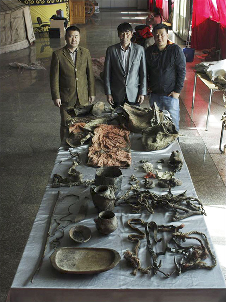 Кроме останков женщины, завернутых в войлок, в могиле обнаружили останки принесенной в жертву кобылы, а также седло, уздечку, и хозяйственную утварь: глиняную вазу, деревянную чашу, железный чайник, корыто и котел. Помимо них в захоронении находилась баранья голова, дорожная сумка с бараньим мясом и кости козы. По словам археологов, это первое нетронутое тюркское захоронение, найденное в Монголии, а возможно, и в центральной Азии.