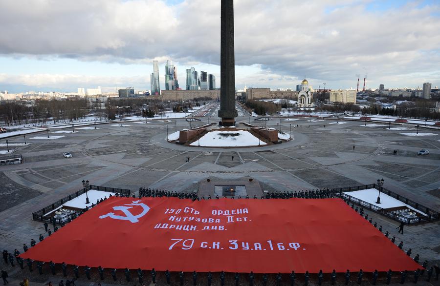 В рамках проекта курсанты МЧС развернули рекордную копию знамени площадью более 1 тыс. квадратных метров на Поклонной горе в Москве.
