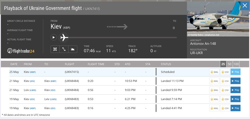 12.10 Ан-148 с бортовым номером UR-UKR, который украинские СМИ называли самолетом президента Украины, должен совершить 25 мая один рейс — об этом свидетельствуют данные Flightradar24. Однако пункт назначения не указан, и по состоянию на полдень среды борт находился в киевском аэропорту Борисполь.
