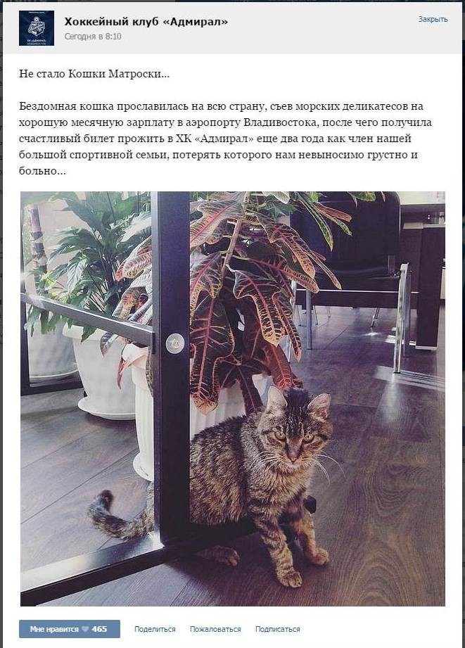 «Не стало Кошки Матроски... Бездомная кошка прославилась на всю страну, съев морских деликатесов на хорошую месячную зарплату в аэропорту Владивостока, после чего получила счастливый билет прожить в ХК «Адмирал» ещё два года как член нашей большой спортивной семьи, потерять которого нам невыносимо грустно и больно…», — сообщается на официальной странице клуба в соцсети «ВКонтакте».