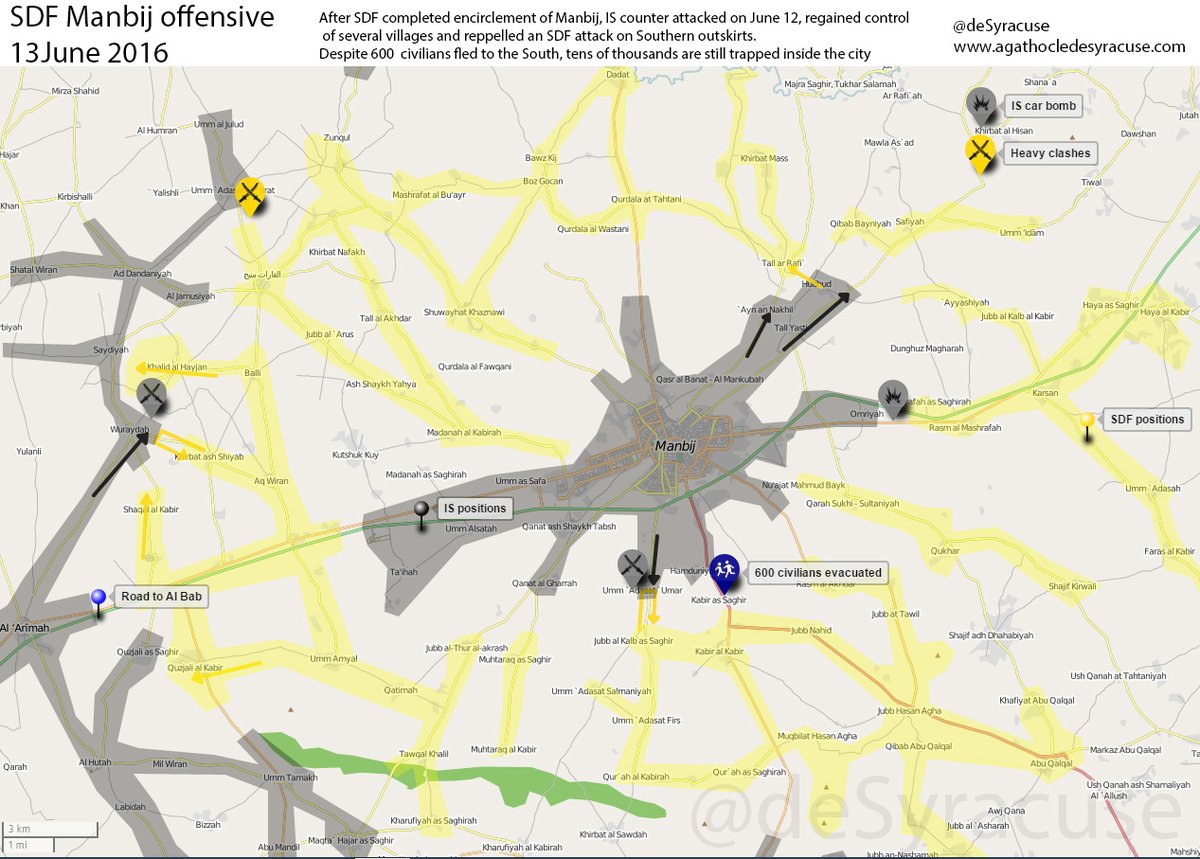 Курды пока продолжают обжимать окруженный город отбивая как попытки контратак Халифата из Манбиджа, так и попытки деблокады со стороны Аль-Баба. Проблема с немедленным наступлением на Аль-Баб заключается в том, что у курдов недостаточно сил, чтобы обложить город и оставив его в тылу, наступать на Аль-Баб, так как группировка Халифата в Манбидже наверняка попытается ударить по коммуникациям войск наступающих к западу от города. Поэтому курды и американцы стоят перед определенной дилеммой. Отложить более амбициозные планы и заняться сразу Манбиджем, или же рискнуть, сделав ставку на немедленный прорыв к Аль-Бабу.