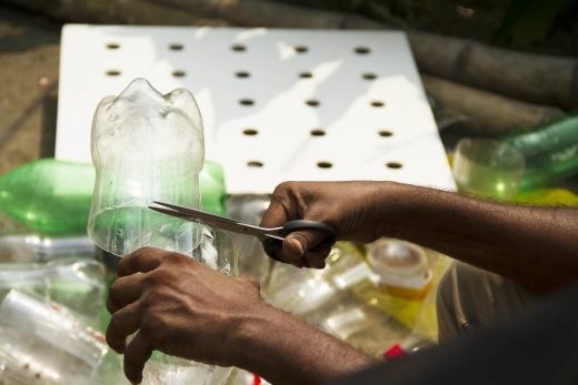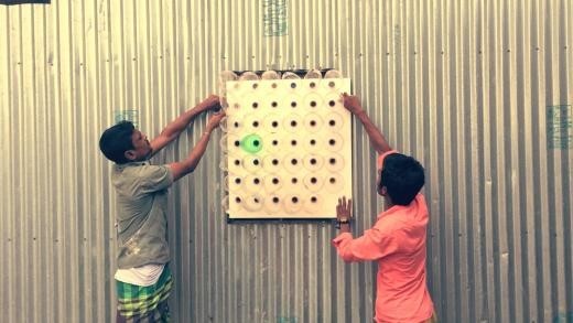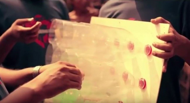 Чтобы решить проблему, разработчик создал специальный щит с прорезанными в нем круглыми отверстиями. Он вставляется в стену дома, как москитная сетка в окно. В отверстиях находятся разрезанные пополам пластиковые бутылки, закрепленные разрезанными крышками.