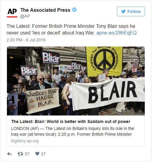 После публикации вердикта комиссии Великобритания раскололась надвое, десятки антивоенных демонстрантов собрались на улицах Лондона с плакатами с именем Блэра.