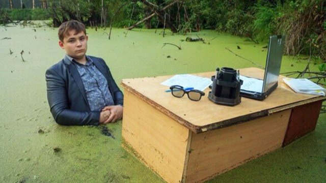 Игорь Назаров оделся в рубашку и строгий костюм и полез в болото ради конкурса необычных фотографий, организованного сообществом «Как я встретил столбняк» в социальной сети «ВКонтакте». Чтобы сделать эффектные снимки, подросток уселся за рабочий стол прямо посреди зеленого болота.
