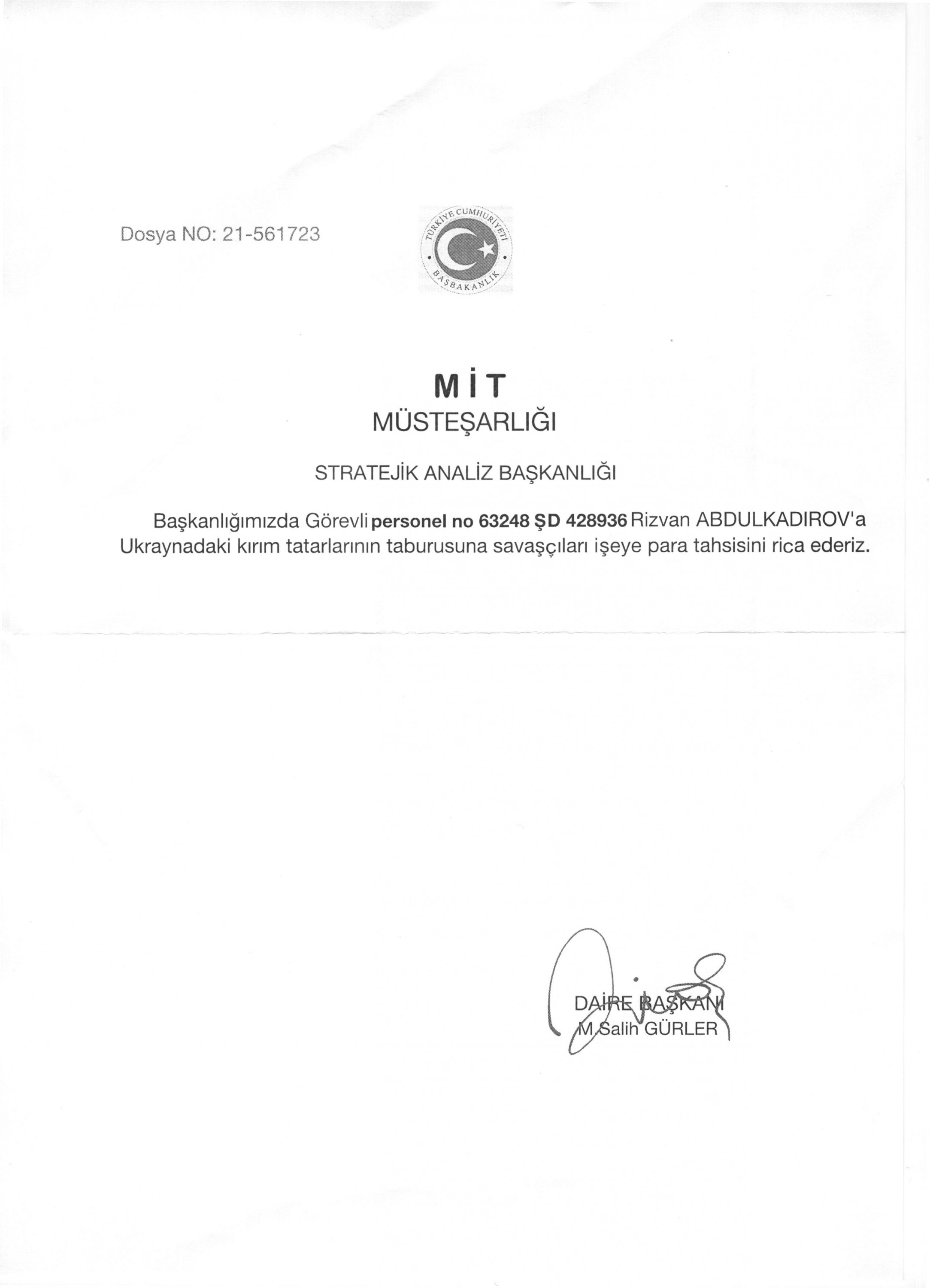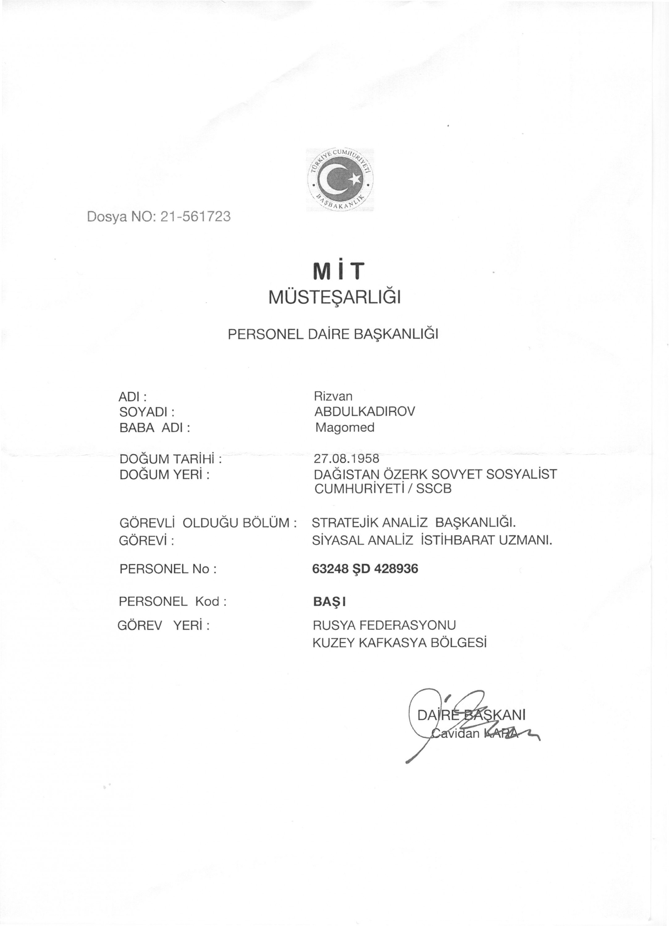 Абдулкадыров Ризван Магомедович, 27.08.1958 г.р., агентурный позывной «Başhi», персональный номер «63248 ŞD 428936» - информация, содержащаяся в первых двух документах. Третий документ повествует о выделении Абдулкадырову Р.М. денежных средств из турецкой казны для вербовки боевиков в Крымско-татарский батальон.