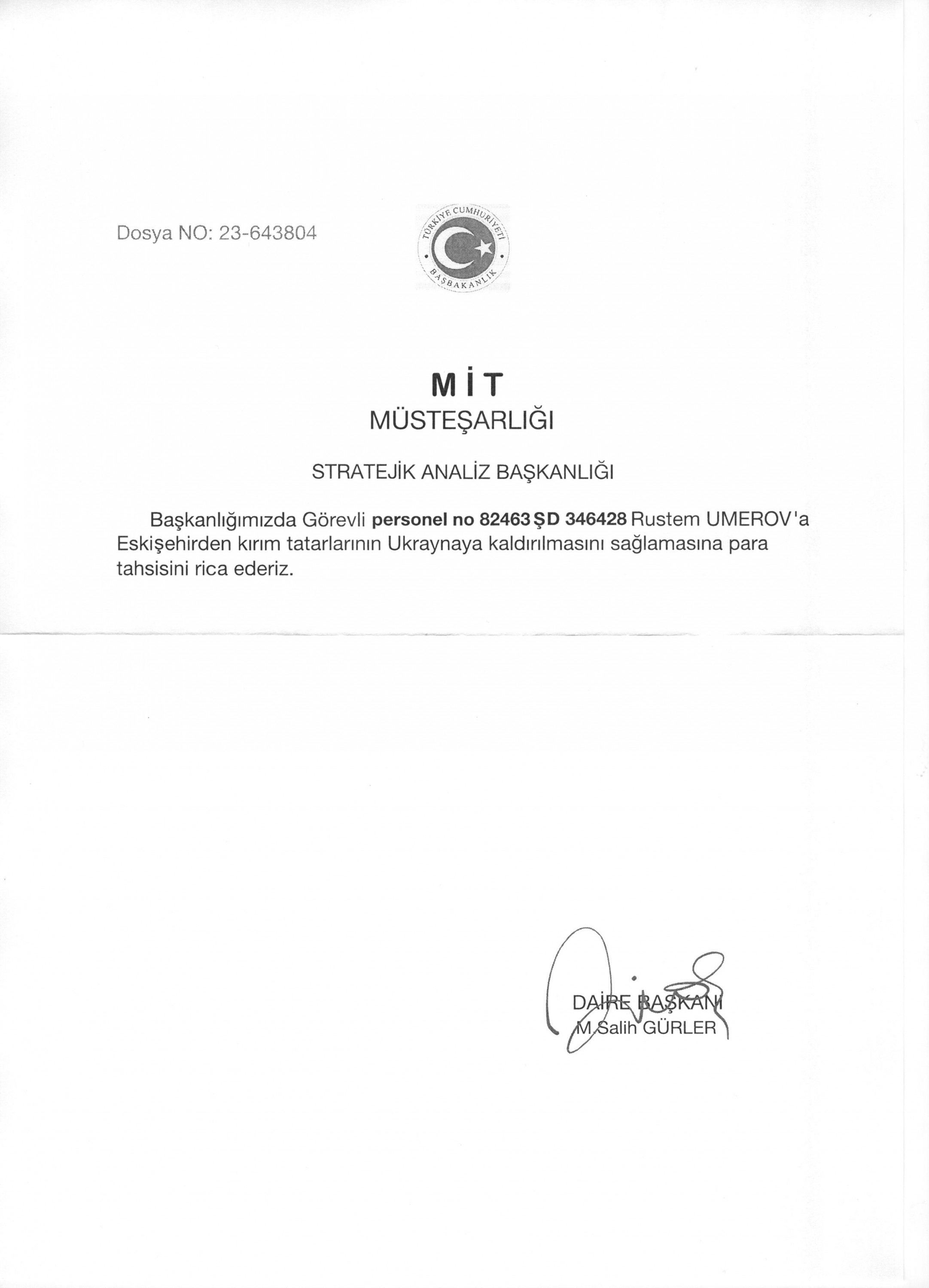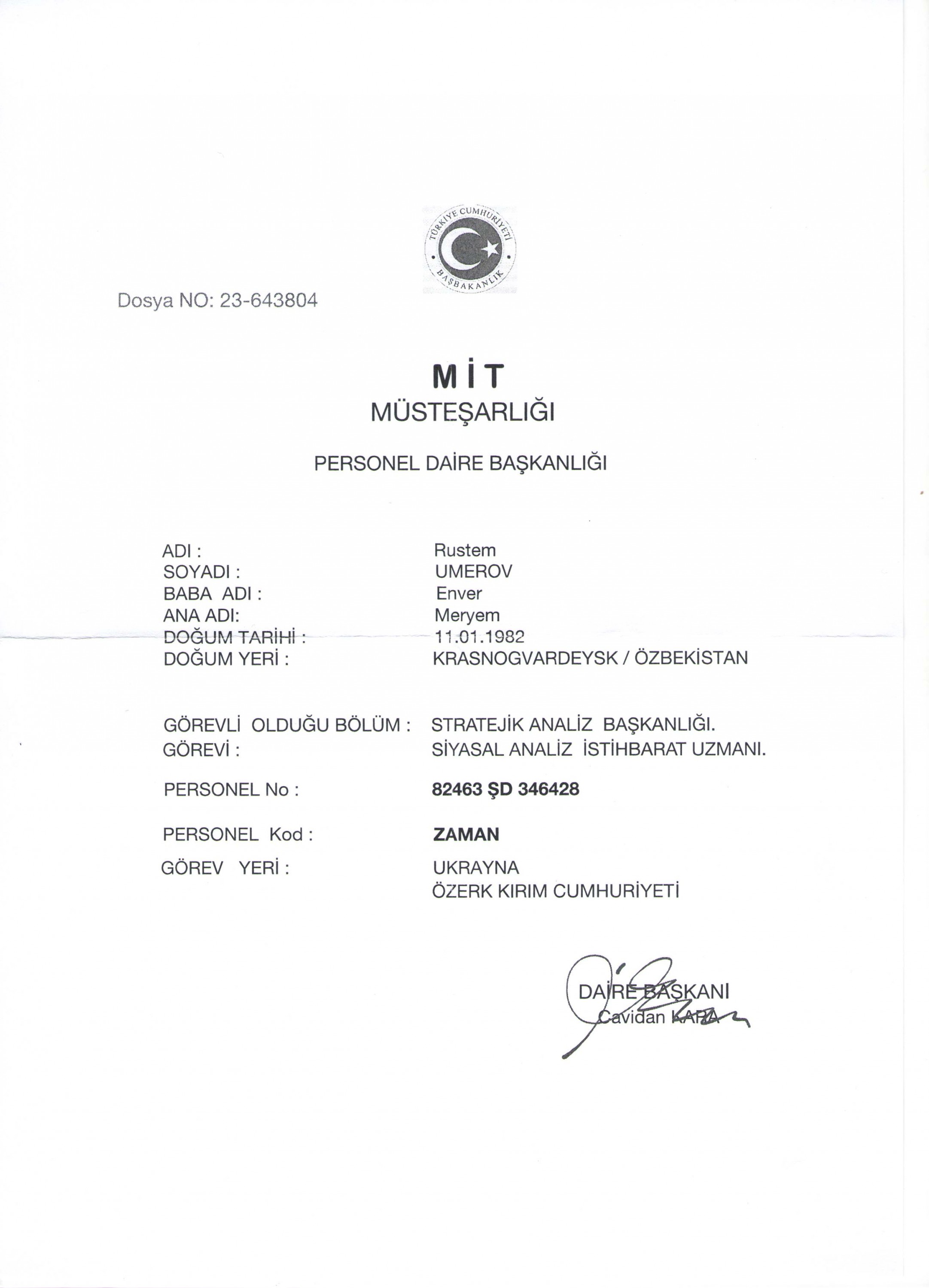 Умеров Рустем Энверович, 11.01.1982 г.р., агентурный позывной «Zaman», персональный номер «82463 ŞD 346428» - информация, содержащаяся в первых двух документах. Третий документ повествует о выделении Умерову Р.Э. денежных средств из турецкой казны для переселения Крымских татар из Турции на Украину: