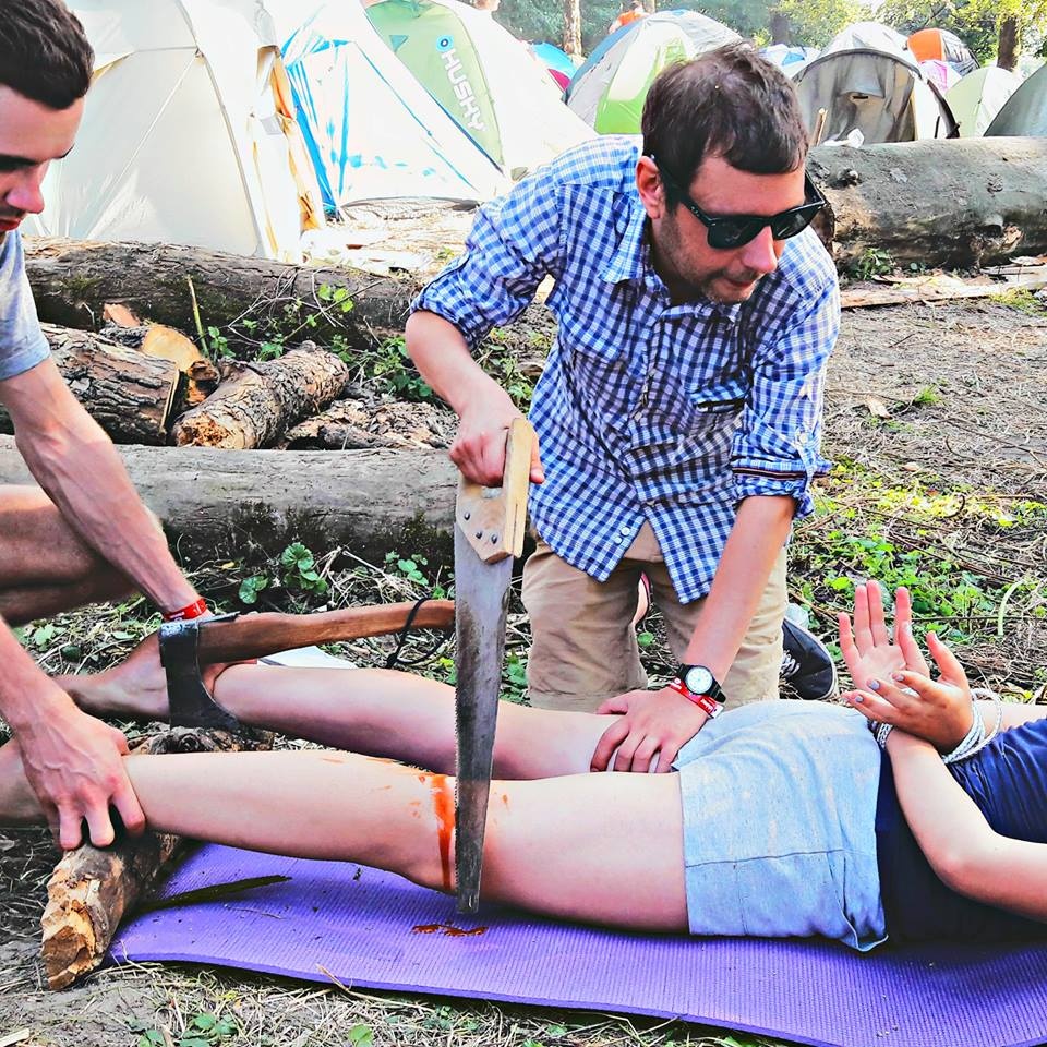 На своей странице в Facebook он опубликовал фотографию, на которой делает вид, что пилой отрезает ногу девушке.