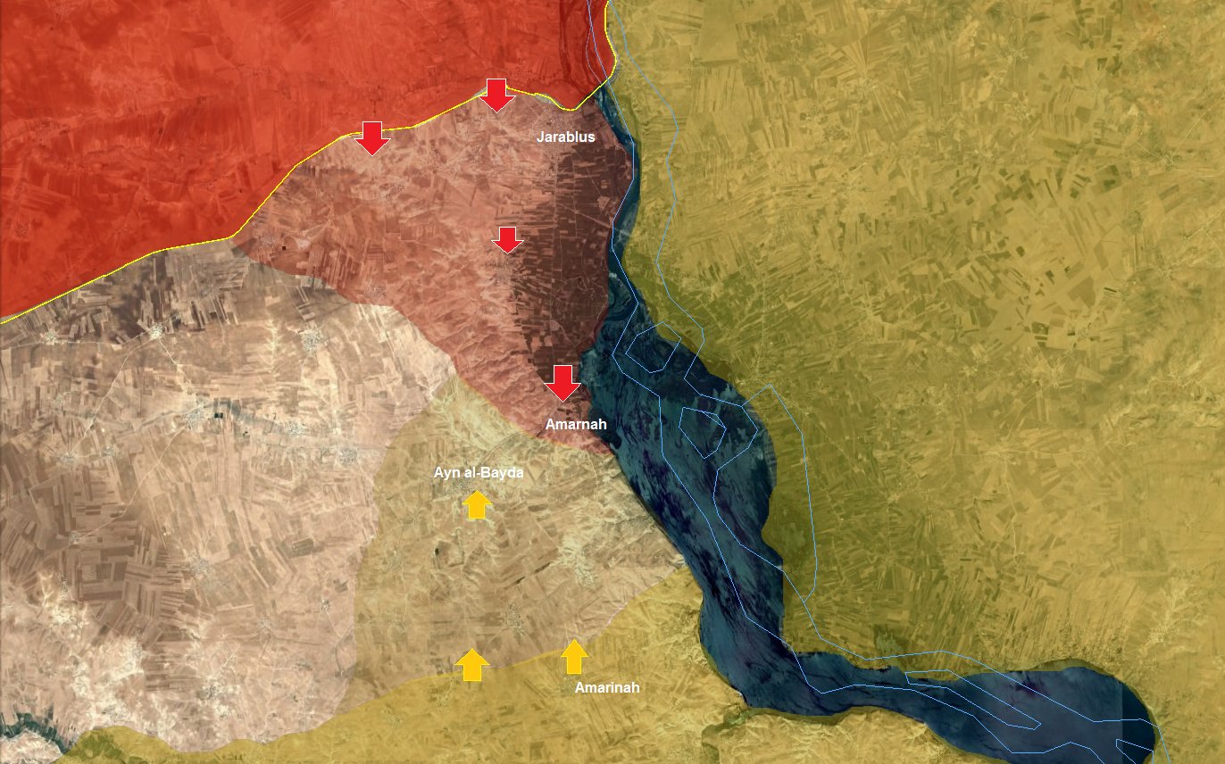 В ходе начавшегося с утра наступления турецкой армии и протурецких боевиков на севере Сирии, к вечеру сегодняшнего дня они практически полностью овладели крупнейшим из оставшихся форпостов Халифата в северной Сирии - городом Джараблус. Перед лицом явно превосходящего противника, Халифат особо не упирался и начал отступать от города на юго-восток, попутно подвергаясь ударам турецкой и американской авиации.