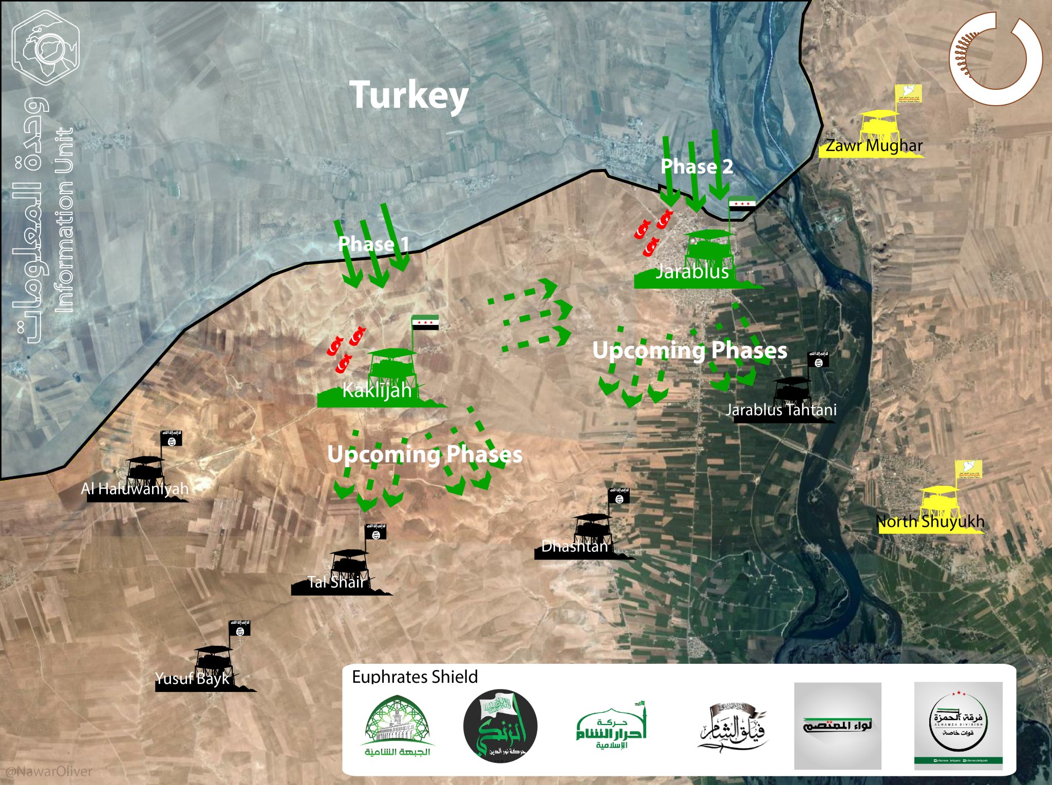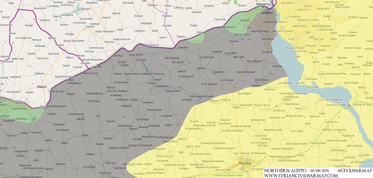 По сути, первоначальная задача Турции - взять под контроль всю границу от Аль-Раи до Джараблуса и потом начать теснить Халифат на юг, чтобы максимально ограничить распространение курдов к северо-западу от Манбиджа.