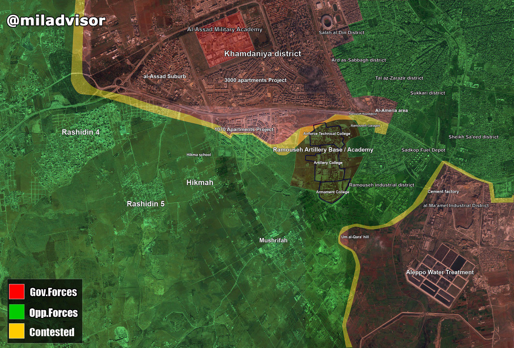 Фронт в районе Рамусеха достаточно стабильный, боевики сидят в северной и центральной части квартала опираясь на здания пекарни, муниципалитета и почтового отделения. Основные силы САА и "Хэзбаллы" сидят на цементном заводе и водной станции. Периодически сирийцы пытаются прощупать оборону боевиков в южном Рамусехе, но без особого энтузиазма. Сегодня например пехота САА снова просачивалась в южную часть Рамусеха, но закрепиться там не смогла. Сам квартал в силу продолжающихся авиаударов по нему сильно разрушен.